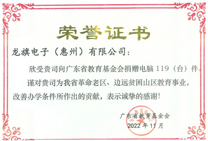 2022年11月,龍旗科技參與了“綠色愛心電腦教室”的捐贈活動,特向廣東省教育基金會捐贈119(臺)電腦,這批電腦將作為廣東省革命老區、邊遠山區目前尚缺電腦的農村學校的課堂教學機器,用以改善辦學條件。